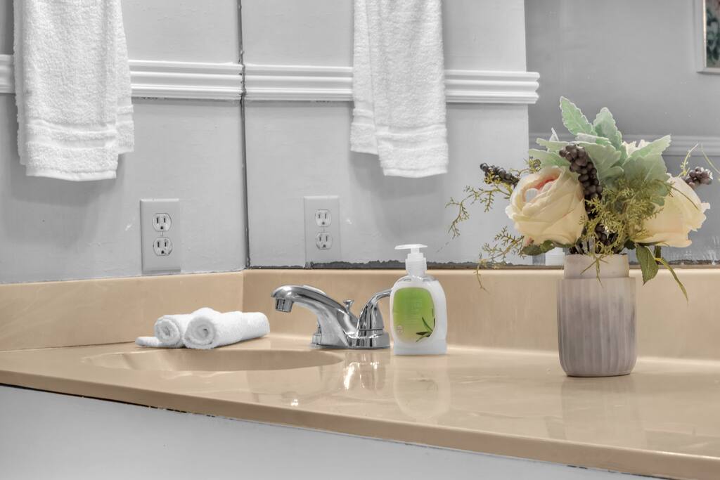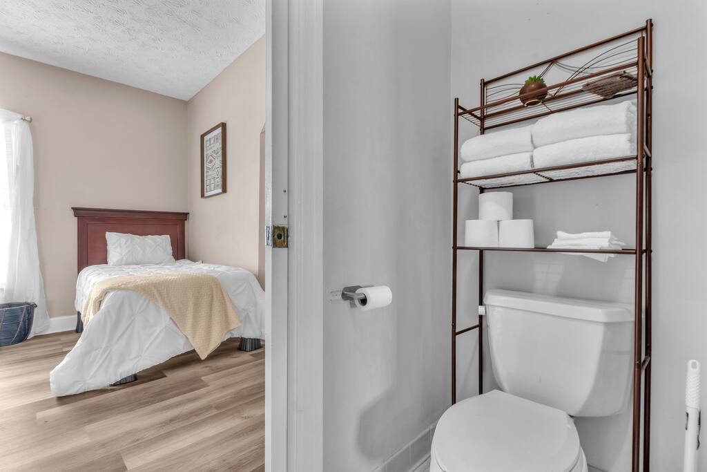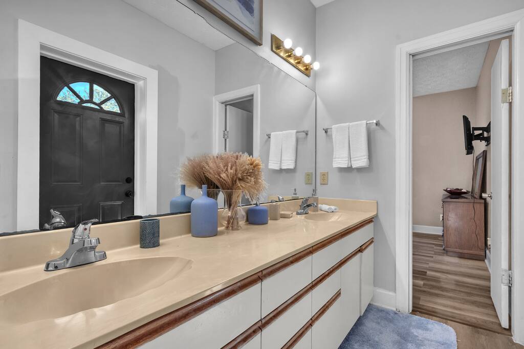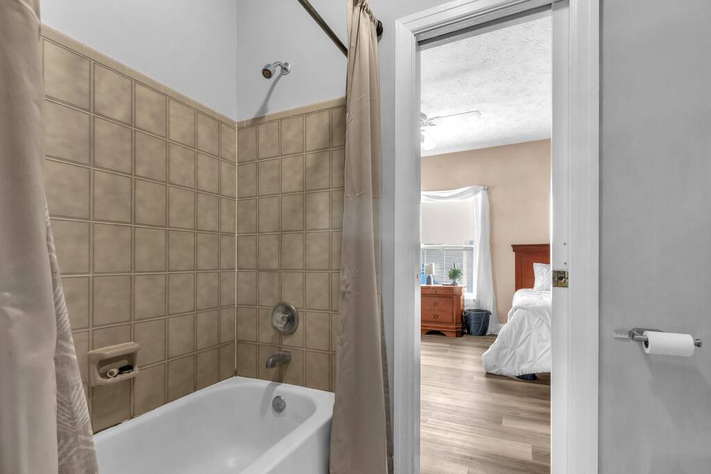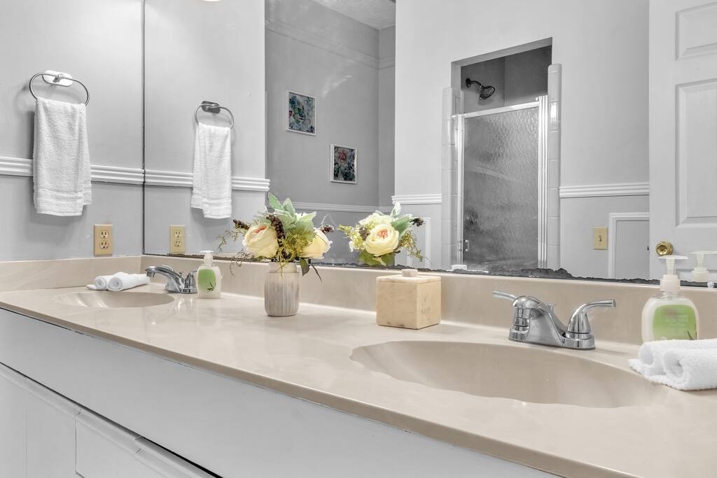 There are 2 full bathrooms amd one half-bath in this home, each stocked with all the essentials you need for the duration of your stay. The mater bedroom is attached to one full bath, which features a walk-in shower. The upstairs full bath offers a bathtub & shower. The half-bath is conveniently located downstairsand easily accessible from the main living area.