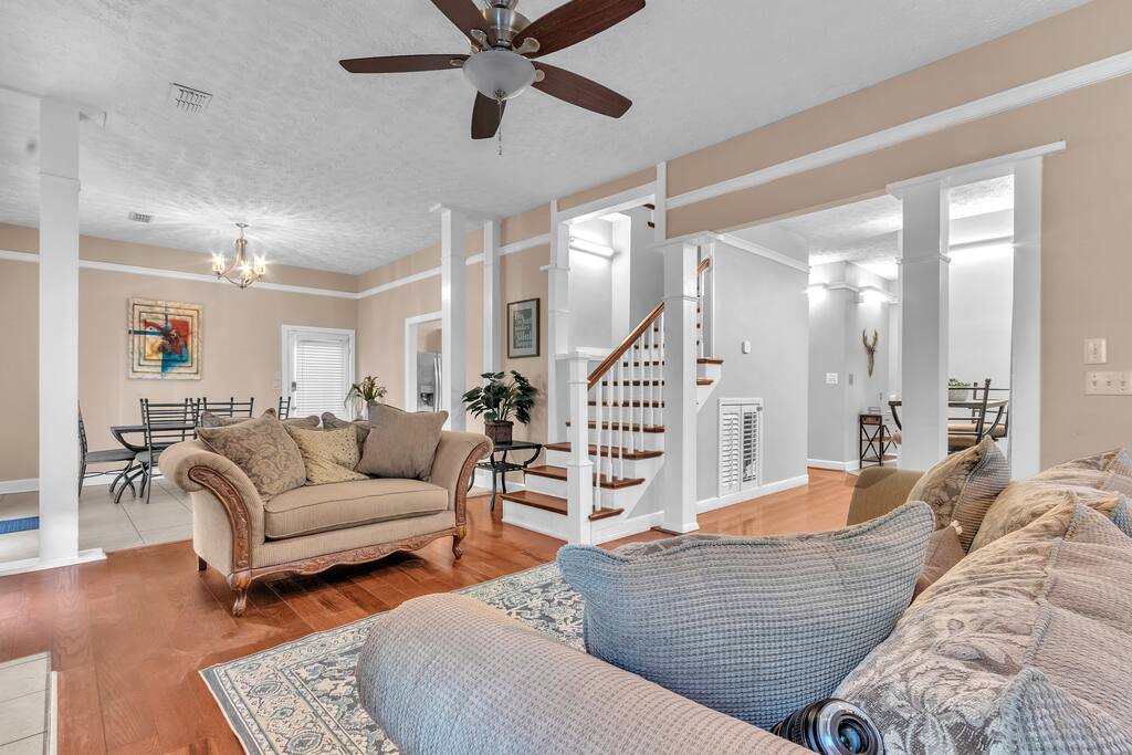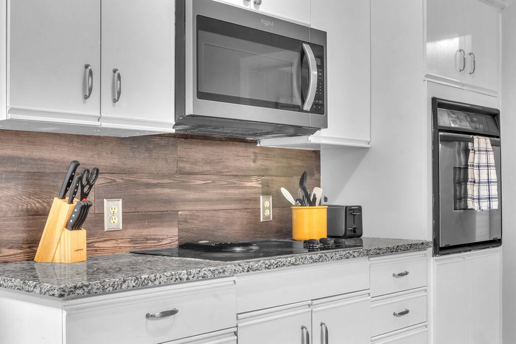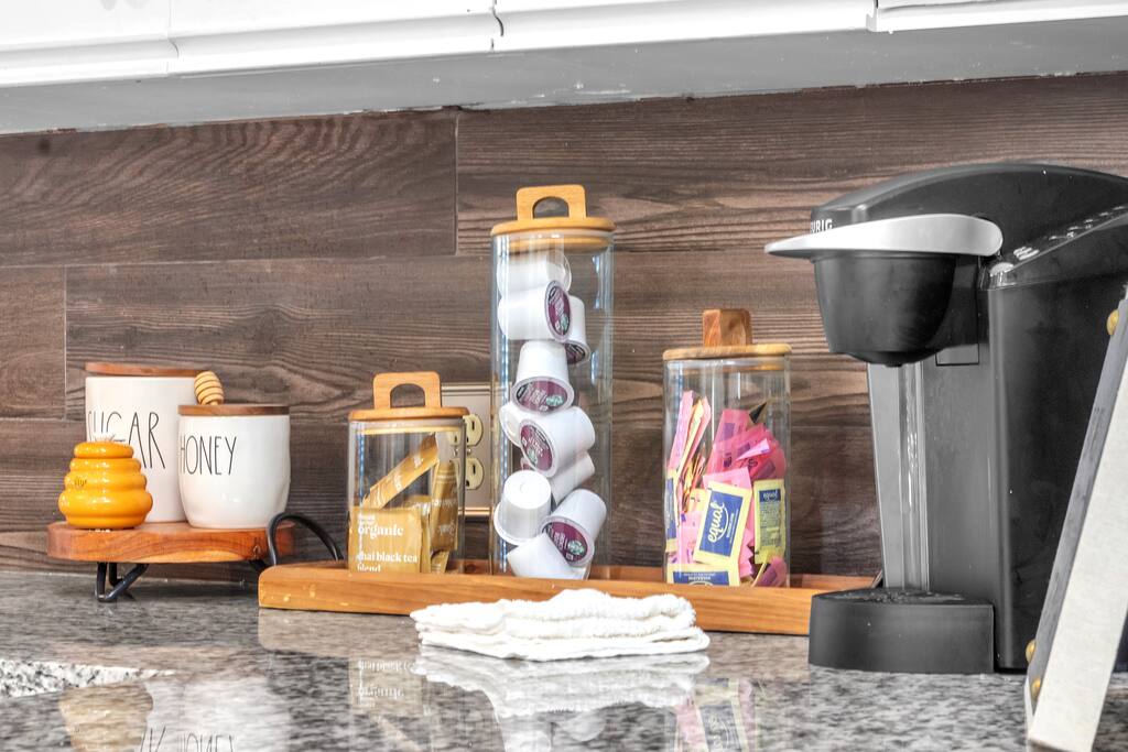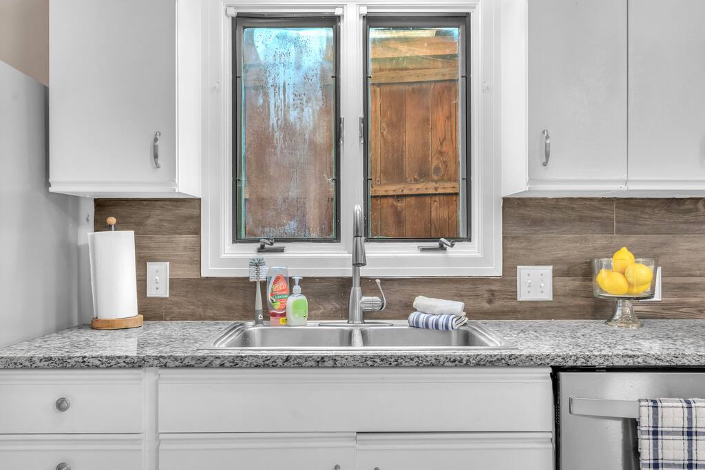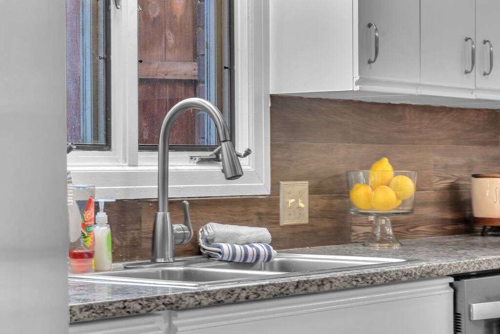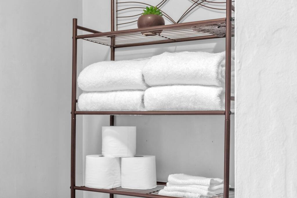 There are 2 full bathrooms amd one half-bath in this home, each stocked with all the essentials you need for the duration of your stay. The mater bedroom is attached to one full bath, which features a walk-in shower. The upstairs full bath offers a bathtub & shower. The half-bath is conveniently located downstairsand easily accessible from the main living area.