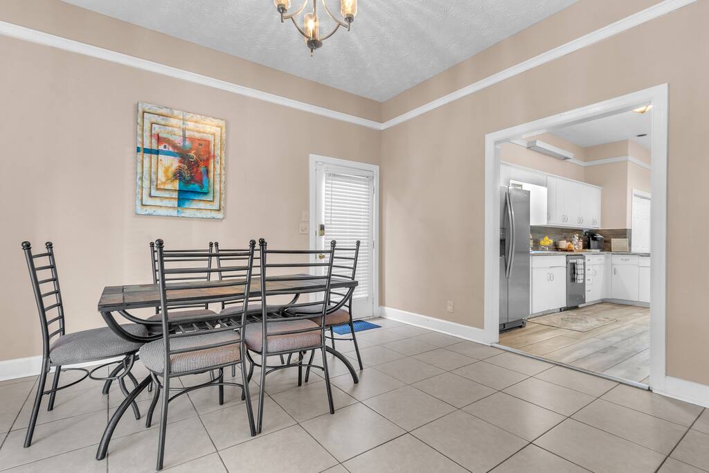 The bright and airy kitchen is equipped with all the appliances, utensils, and cookware you need to feel at home. The dining area seats 6 guests.